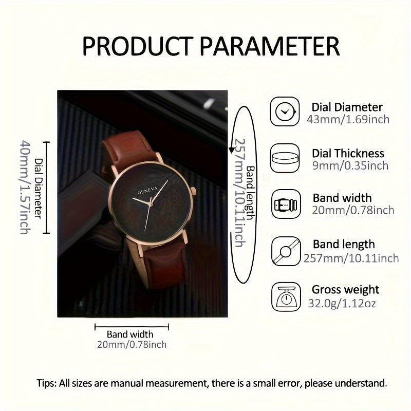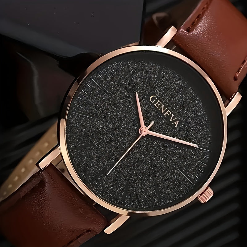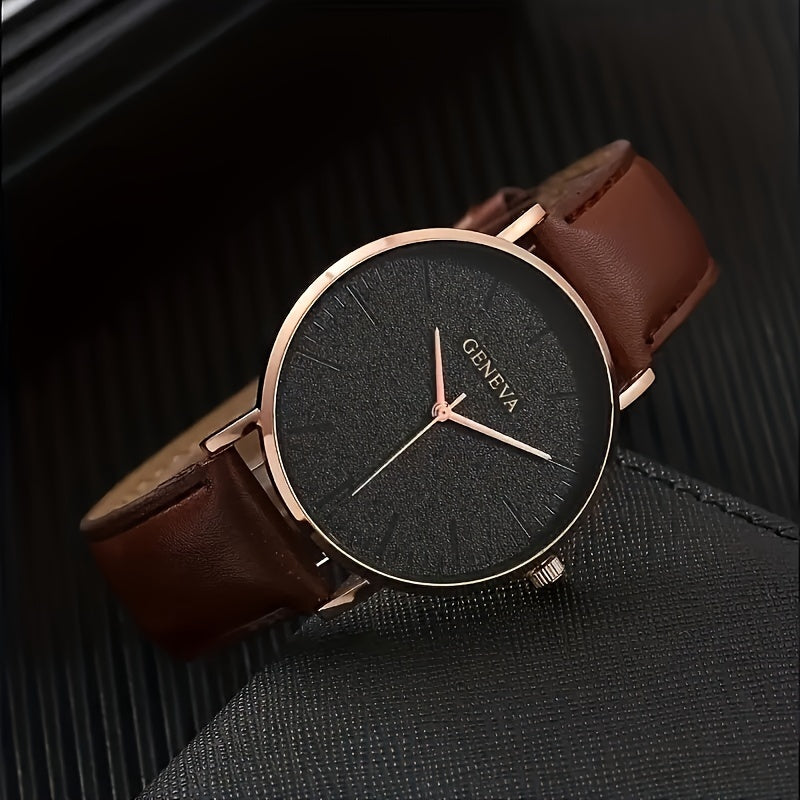 GENEVA Men's Fashionable Elegant Quartz Watch, Round Case, PU Leather Strap, Alloy Body, Non-Wireless, Non-Rechargeable Battery (Button Cell, Diameter < 20mm)