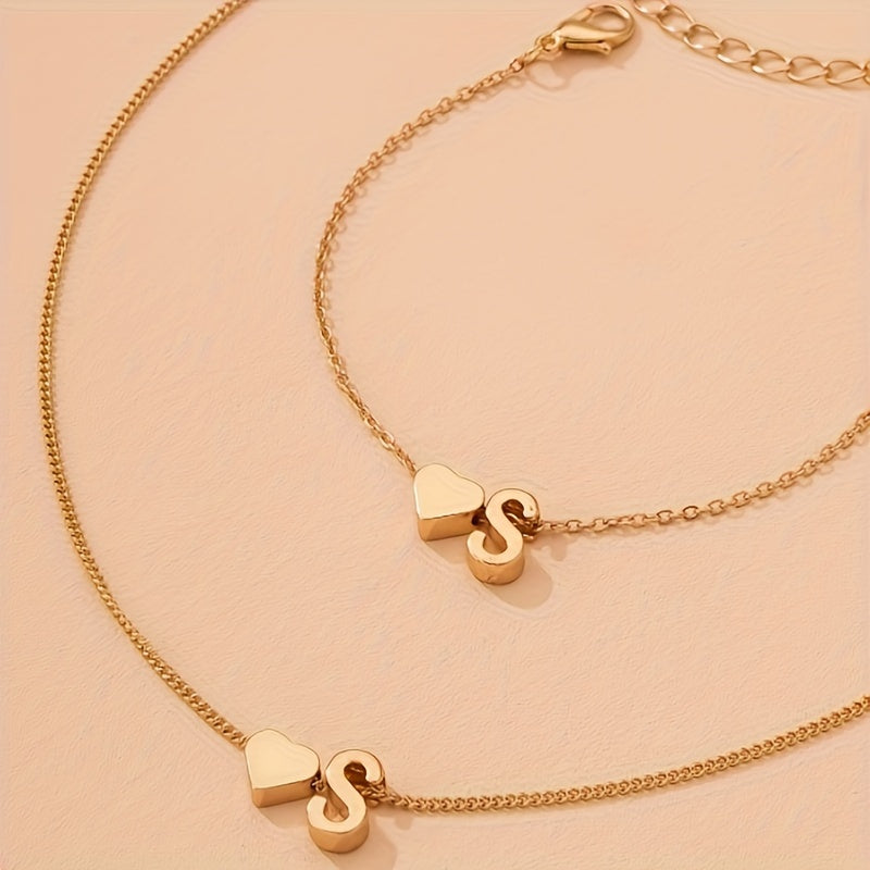 Set of Small Peach Heart Letter Necklace and Bracelet for Women